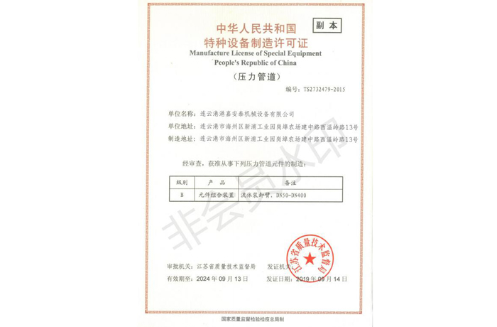 資信等級證書裝車鶴管適用于汽、煤、柴油,液態(tài)化工介質汽車、頂部裝卸車。裝車鶴管可以分為三類,分別是:全自動鶴管、氣動帶手動鶴管、手動鶴管。裝車鶴管還有三個特殊功能,分別是:氣相回收,伴熱保溫,變形產(chǎn)品。 鶴管操作規(guī)則流程: a.鶴管在裝車前,操作人員需要對油庫油臺設施的完好性進行檢查,檢查靜電接地線,確保油車主梁上緊固有效。 b.靜電接地線應在卸油前連接好;按規(guī)定做好穩(wěn)油靜置工作 c.將溢油探頭放至油缸口安全高度位置 d.在鶴管裝卸油結束后,需將尾管里的余油、氣體排空后才能提出放置原來位置。<了解詳情>